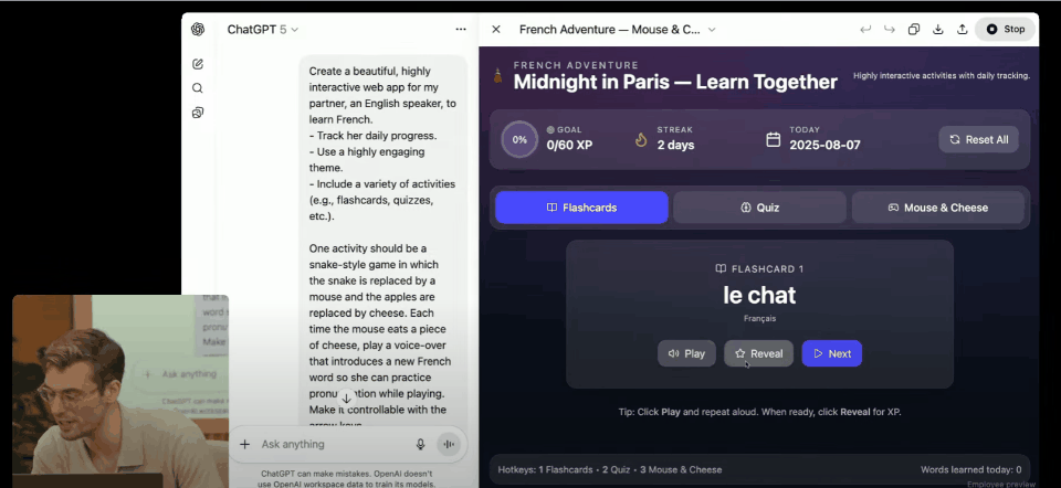 你想学习法语,GPT-5能按照你的要求去生成一个像多邻国一样的学习应用,你可以用来背单词,还能通过贪食蛇来帮你复习。如果你对生成的应用有不满意的地方,也可以直接通过自然语言让GPT-5帮你修改。