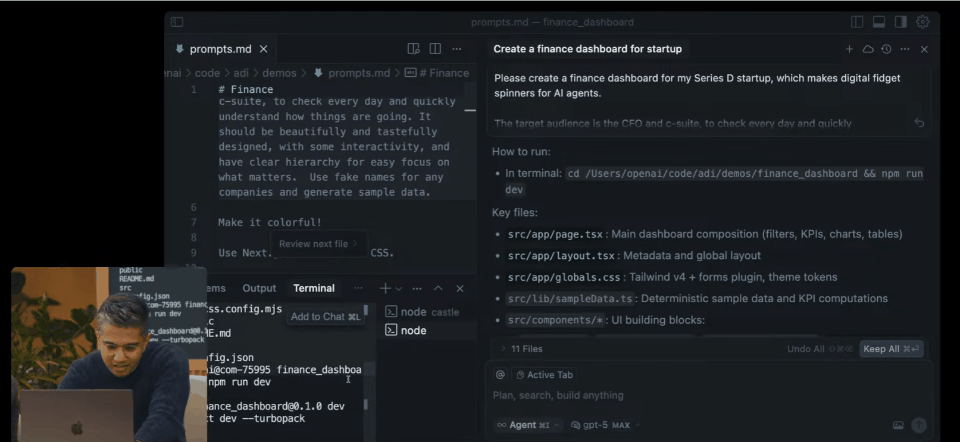 如果你是一个创业公司的CFO,你可以让GPT-5用大概3分钟的时间,根据你的所有数据,生成一个详细的财务状况的可互动的演示板。而你需要的仅仅是一个100字左右的描述。GPT-5可以从零生成代码,保证完成,它能猜测你想呈现的形式并自动帮你优化代码和呈现的效果。