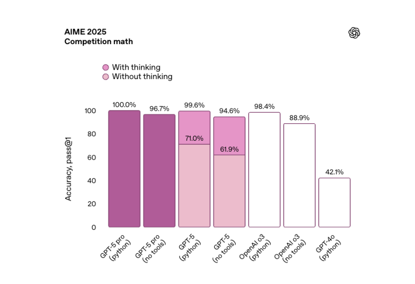 在OpenAI的评估中,GPT-5(具备思考能力)的表现优于 OpenAI o3,在视觉推理、代理编码和研究生水平的科学问题解决等功能上,输出 token 数量减少了 50% 至 80%。