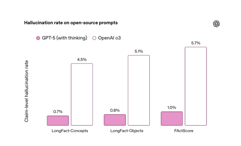 在启用搜索的情况下,GPT-5出现事实性错误的概率比GPT-4o降低约45%。在“思考(thinking)”模式下,这一概率比OpenAI o3降低80%。