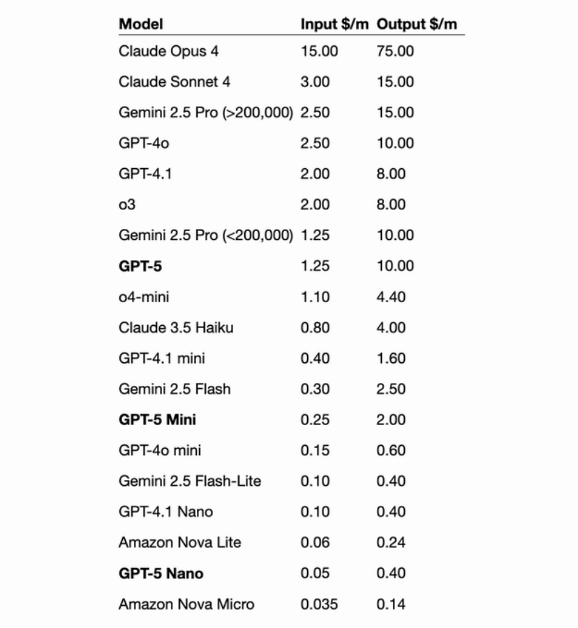 API价格方面,GPT-5性能最强,价格却低得离谱,看来OpenAI是掌握了跨代的优化方法。