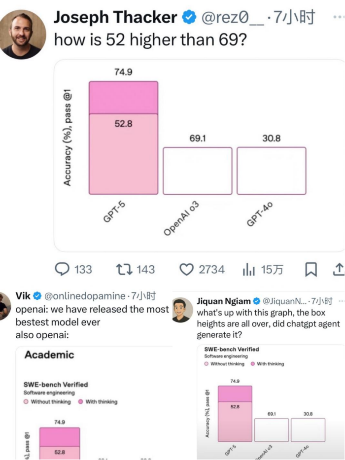 奥特曼倒是大方转发了消息并且称已经改正,一些粉丝认为这只是无心之失。但不少人却觉得这是“有意为之”,是为了让GPT-5显得厉害在图表上玩花招,甚至称之为“本世纪最大的图表犯罪”。