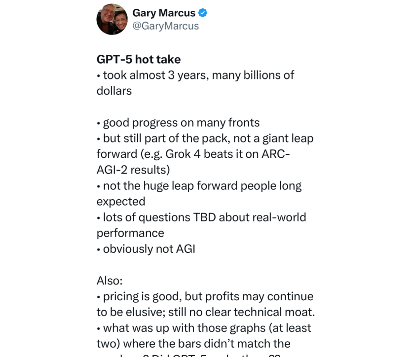 而一向喜欢泼冷水的AI学者盖里·马库斯(Gary Marcus)在赞扬GPT-5有很多良好进展的同时,称这“并非一个巨大的飞跃”,GPT-5也够不上外界的期待。