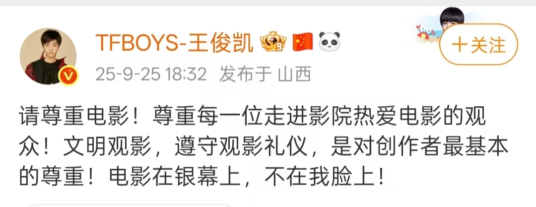 王俊凯今年担任卧虎单元评审,在平遥停留的时间更长了,从开幕到闭幕,大量的粉丝们来到影展,不仅在红毯区蹲守,还买了电影票,希望能够在各个地方偶遇偶像。不过当中也有一些小插曲,比如在某场王俊凯参与观影的放映中,有粉丝全程在观影过程中回身拍摄王俊凯,这使得现场的观影秩序比较混乱。在观影结束后,王俊凯第一时间发布了微博,态度十分严肃:“请尊重电影!尊重每一位走进影院热爱电影的观众!文明观影,遵守观影礼仪,是对创作者最基本的尊重!电影在银幕上,不在我脸上! ”