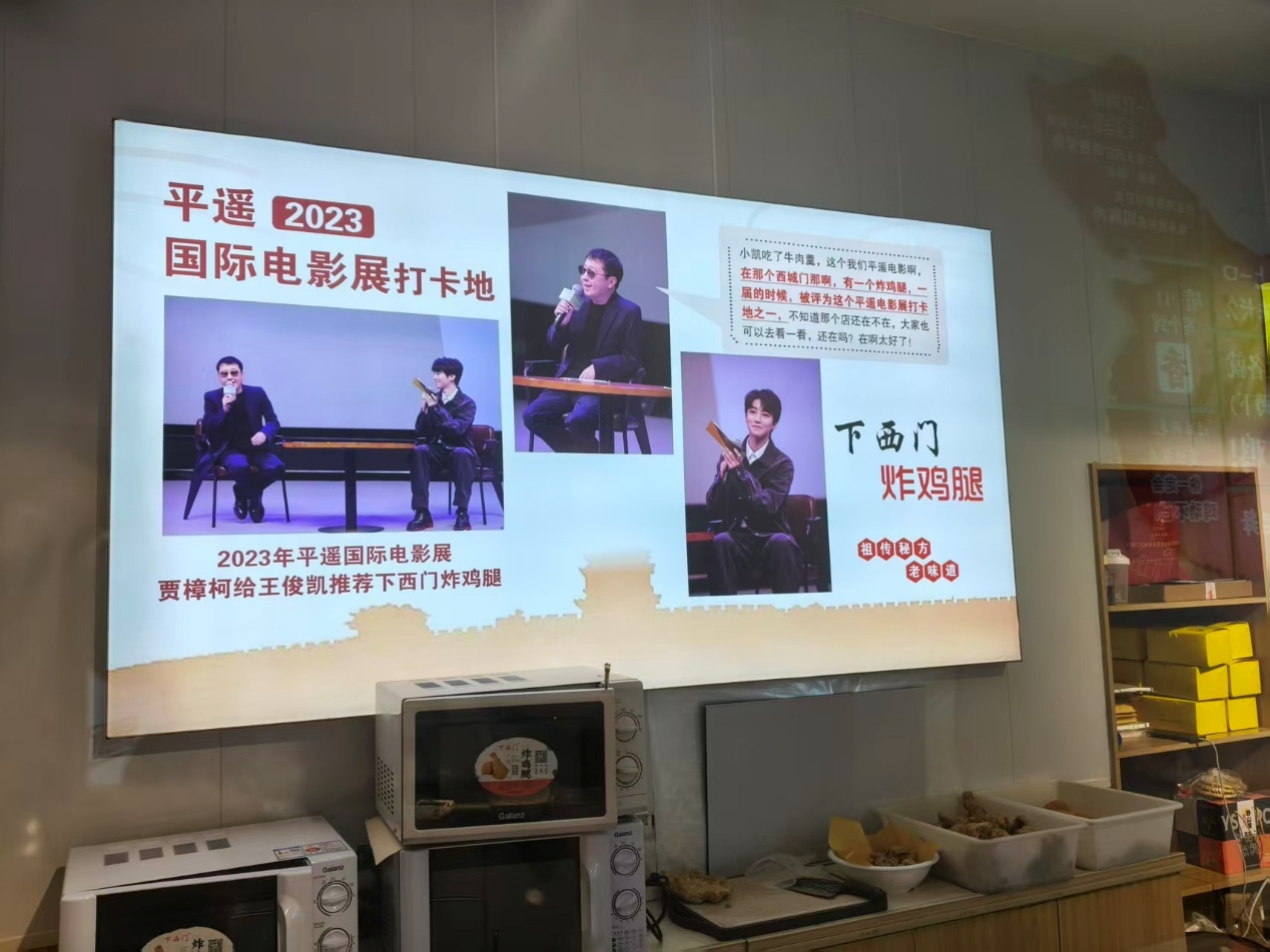 其实相较初始几届的时候,现在的平遥古城本就随着山西文旅的火爆,要招待更多的游客,现在一进入古城,迎面而来的就是一些穿着古风服装的“晋商少奶奶”们,旅拍店也越来越多,店铺之间都在打价格战。当然平遥影展作为一张非常重要的文化名片,如果能联动上那也是最好的,比如古城下西门的炸鸡店,凭借10元3个的超低价格,吸引了很多影展参加者来购买,2023年贾樟柯在影展对谈中向王俊凯推荐了这家炸鸡店,炸鸡店的生意就更好了,而且还把这段对谈视频在店内循环播放,店家也挂上了招牌“平遥国际电影展打卡地”。王俊凯推荐的牛肉羹,各大饭馆也都放在了招牌推荐菜之列,明星效应是商家都想抓住的。