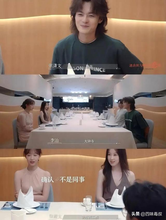 餐桌旁的氛围更像公司食堂的跨部门拼桌,大家互不喊名字,统一称呼老师,拘谨中带着职业化的礼貌。有男嘉宾刚收到女嘉宾的约会邀请,转头就找地方随地大小班。有嘉宾在后采时突然接到老板电话,下意识应答,挂完电话的苦笑让屏幕前的观众瞬间代入。