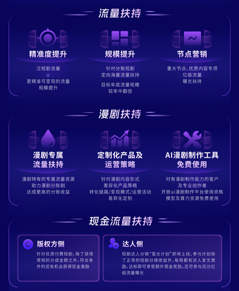 为了帮助短剧版权方、创作者获得更好的收益,快手还推出分账短剧扶持政策——提供亿级流量规模加码、优质内容专属流量池、重要节日及营销节点额外扶持等流量扶持,以及面向版权方的“剧燃计划”、面向达人的“荧光计划”等现金扶持,通过曝光流量和现金激励,助力生态伙伴快速成长与变现。