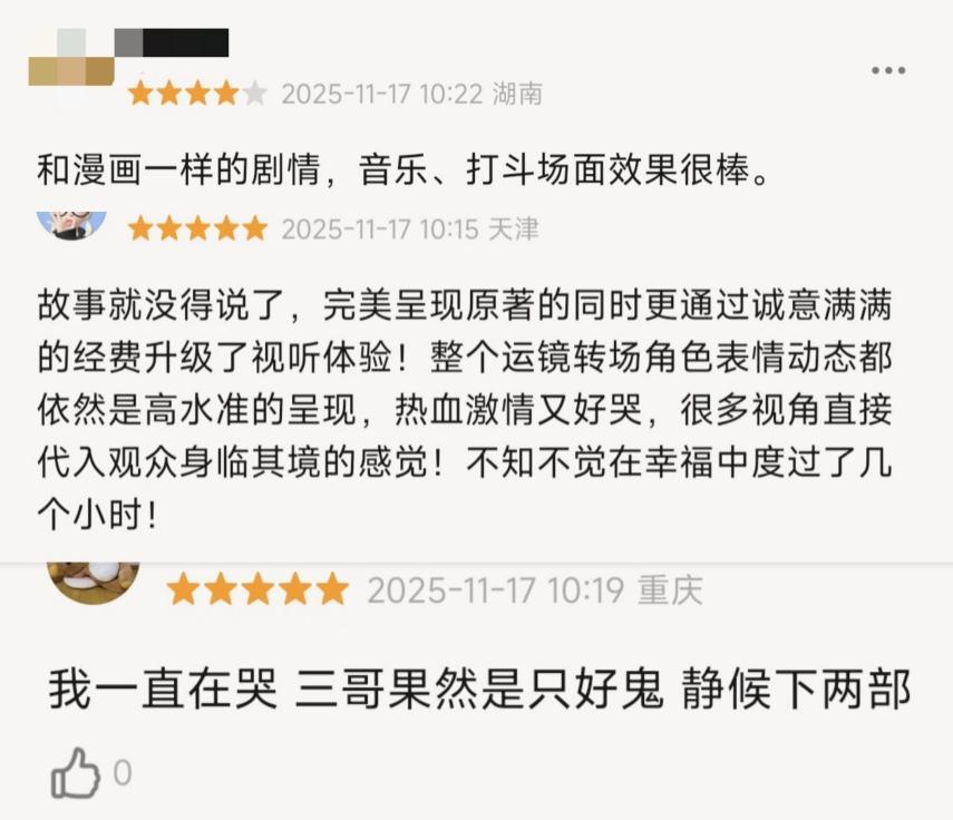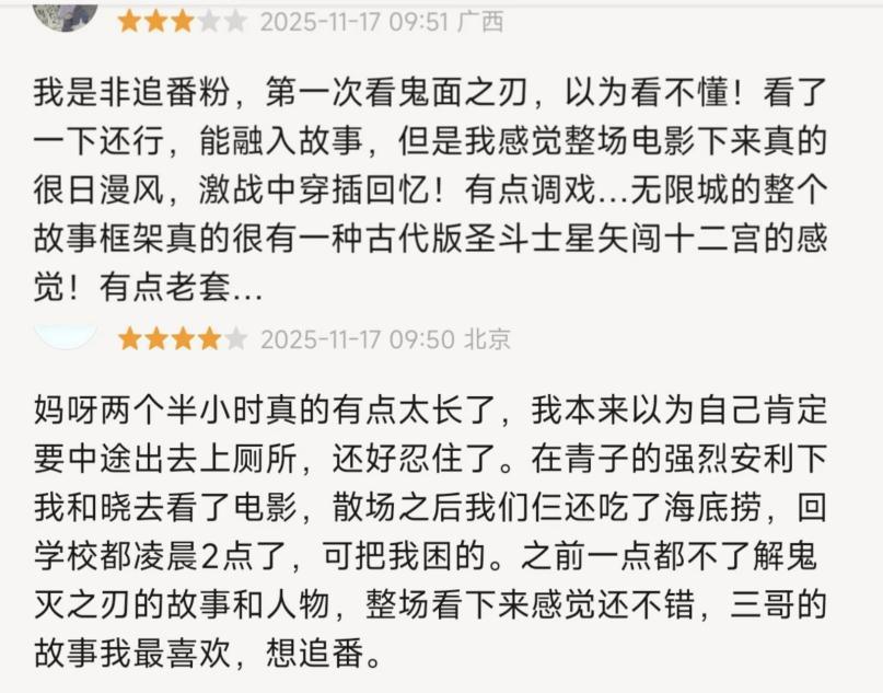 首先,它有一定比例的受众群体,粉丝的粘性可以撑起基本盘。作为现象级二次元IP,《鬼灭之刃》早已通过番剧、前作剧场版吸引了大波粉丝,因此在这个群体内早已初步形成了情感积累,他们对IP的角色本身、人物关系、世界观等设定烂熟于心。且根据大部分IP粉的观后感来看,无明显“魔改”“雷人”“注水”等情况。于是影片上线后,迅速收获这波观众的自发传播,在社交平台上好评满满,推高了口碑评分,带动了首轮观影热潮。