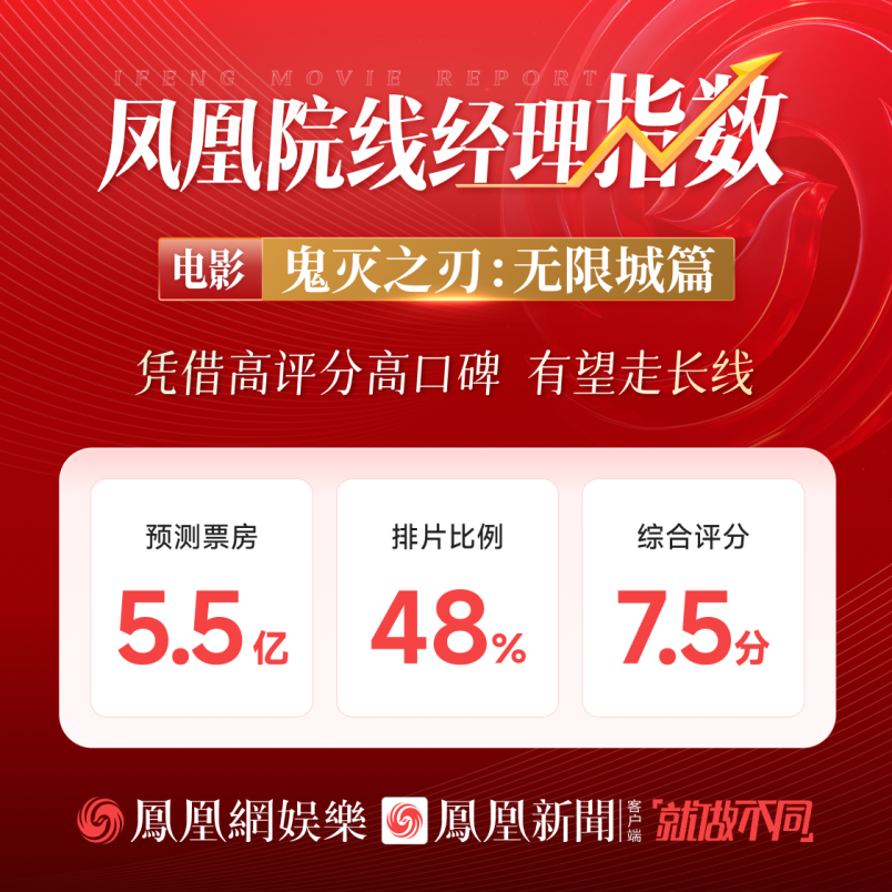 此前,凤凰网娱乐“凤凰院线经理指数”栏目预测该片最终票房5.5亿,排片比例预计为48%,综合评分7.5分。