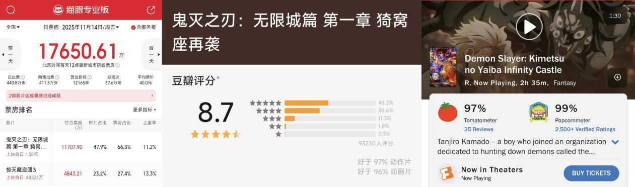 11月14日,动漫界现象级IP《鬼灭之刃》的巅峰之战——《无限城篇》三部曲首部曲在中国大陆正式上映。截止11月17日11时许,该影片累计已获3.83亿票房。据猫眼,《鬼灭之刃:无限城篇》上映首日,票房突破1.17亿,是同日上映的好莱坞热门影片《惊天魔盗团3》票房的两倍多,刷新中国影史日本进口电影首映日票房纪录。上映首个周末(11月15-11月16日)热度不减,周六周日两天票房突破2.37亿元,势头持续强劲。高票房的同时还有高口碑:豆瓣评分8.7,烂番茄指数97%,观众满意度99%。另据IMAX数据,该片首周末IMAX票房“斩”获8750万人民币,以1%的银幕数,收获23%的票房占比,一举打破日本影片在IMAX中国市场的最高首周末票房、人次和占比纪录。