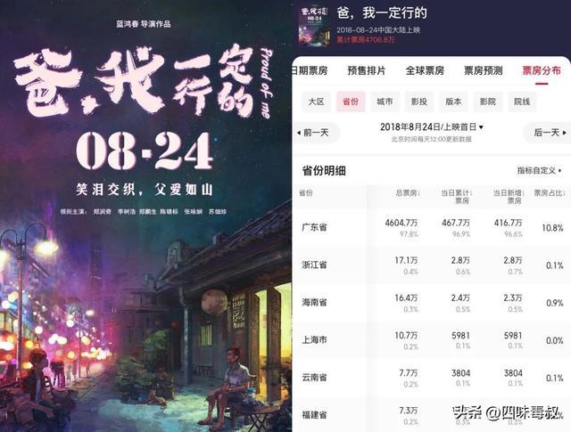 分线发行背后的逻辑基础是,方言电影在特定文化区域内具有强大的票房号召力。以潮汕电影《爸,我一定行的》(2018年)为例,在潮汕地区多家影院排片比例高居榜首,甚至超越了同期上映的好莱坞大片。在潮汕人聚居的广州、深圳,票房表现同样亮眼,广东地区贡献了4604万票房,占总票房比例97.8%。