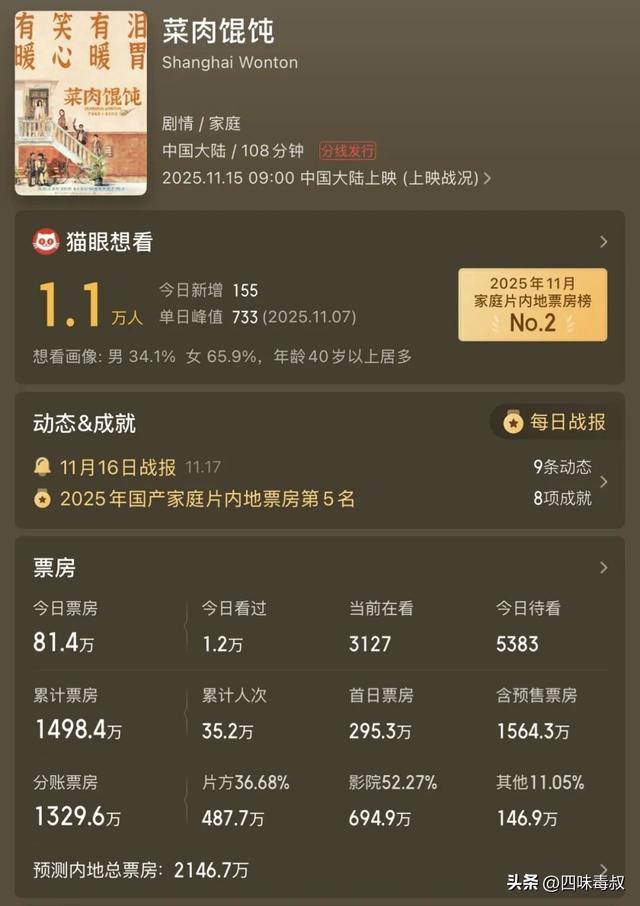 截至发稿前,《菜肉馄饨》的累计票房达到1498.4万,预测总票房已突破2000万,要知道,它上映仅5天(仅包邮区上映),没有流量明星、没有热门话题,市场大盘冷淡,在这么苛刻的前提下,这个票房成绩显得尤为可观。