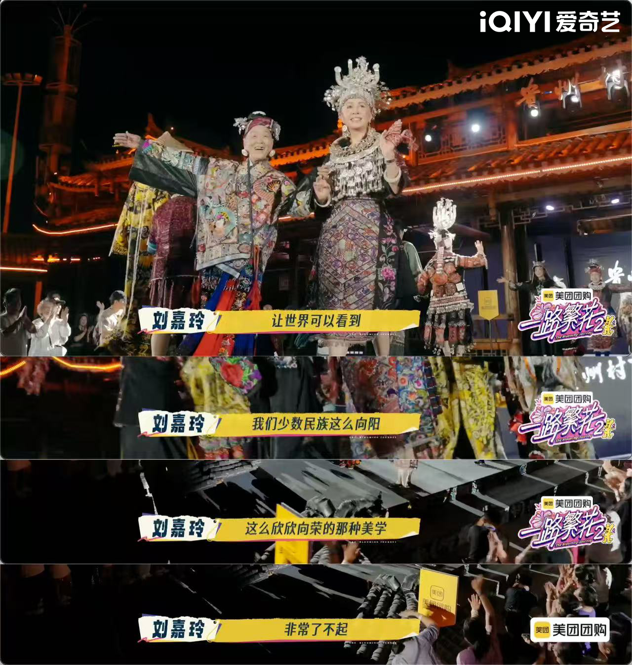 而本期最大看点,莫过于繁花团在贵州村T的惊艳亮相。姐弟们亲自参与服饰挑选、妆发、走秀全流程,近距离触摸民族传统服饰上的纹样与刺绣工艺。据悉,贵州村T是以村民为主体,将苗绣、银饰、芦笙舞等非遗元素搬上T台的公益性文化展演活动,台上的村民模特虽不专业,但当银饰叮当作响、刺绣流光溢彩,非遗技艺也在行走间焕发出当代生命力,文化自信则以最真实、最朴素的方式被看见。刘嘉玲在参与走秀后动情表示:“能让世界看到我们少数民族这么欣欣向荣的美学,是非常了不起的。”节目以综艺为桥梁,联动当地文旅打通非遗传播的新路径,真正实现了让民族美学“活”起来。