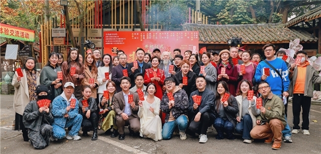 开机仪式现场,充满浓郁的川蜀文化气息。蓝印花布装饰的背景板与川剧脸谱元素交相辉映,非遗传承人现场展示的变脸绝技赢得阵阵掌声,完美呼应了剧集 “让非遗活在当下” 的核心主题。王德顺身着简约中式服装精神矍铄,与总监制董春辉、领衔主演文江、女主角朱小琼及主创团队共同参加开机仪式。