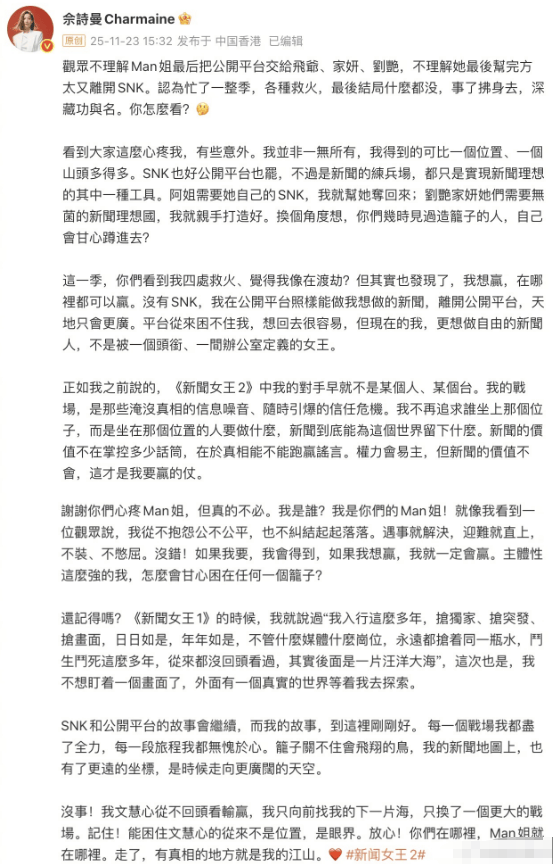 文末,佘诗曼以通透的口吻写道:“SNK和公开平台的故事仍将继续,而属于我的篇章,到这里刚刚好。”她更点明角色内核:“能困住文慧心的从来不是位置,而是眼界。”字里行间尽显角色的洒脱与格局,也让观众感受到这场告别中的不舍与释然。