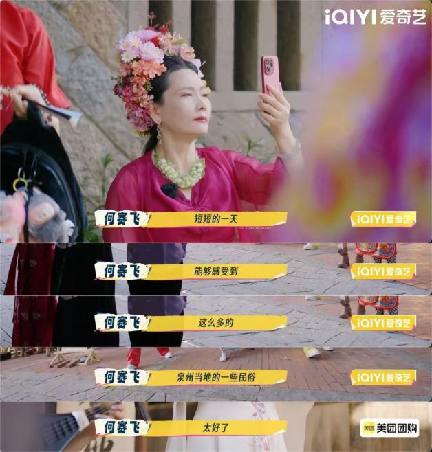 本期节目中,繁花团走进拥有六百余年历史的泉州梧林传统村落,穿梭于红砖古厝之间,沉浸式体验多项国家级非遗项目:佩戴蟳埔女簪花围,尽展女性坚韧与生命之美;学习操控布袋木偶戏,在方寸戏台间体会指掌乾坤的精妙;参与中秋博饼,在骰子翻滚中重温爱拼才会赢的闽南精神。尤其是是博饼环节中的演技小考:姐姐们需隐藏谁吃到芥末月饼和苦茶,由状元候选人轮番猜人。五大影后各展所长同台飙戏:刘晓庆层次分明、何赛飞夸张落泪、刘嘉玲隐忍克制、宁静从容优雅、张柏芝干净利落……现场笑料不断又火花四溅。夜幕降临,众人跟随舞龙队参与烧塔仔仪式——将写满祝福的木柴投入火塔,火星升空,寓意心愿随焰而达。何赛飞感慨:“短短一天能感受到如此丰富的民俗与传统文化,这样的体验太好了!”