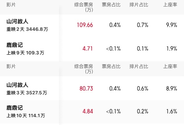 为兑现与影迷的十年之约,2015年上映的《山河故人》也于上周末重映。影片凭借深刻的时代印记与浓厚的人文情怀,在重映首周末票房达190万元,唤醒了不少观众的共同记忆。而另一部于12月5日重映的《鹿鼎记》,上映11天票房仅114.9万,反响较为平淡。