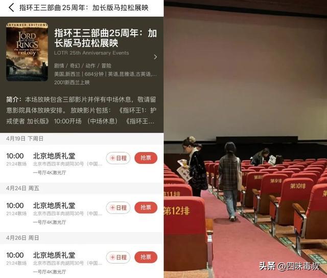 而安排在北京地质礼堂的场次,其座椅狭窄,观影体验难受,坐11个小时简直是极限挑战,因此被影迷们调侃为“仇人场”——意思是,如果你想整一个人,就送他一张地质礼堂《指环王》连放的票。