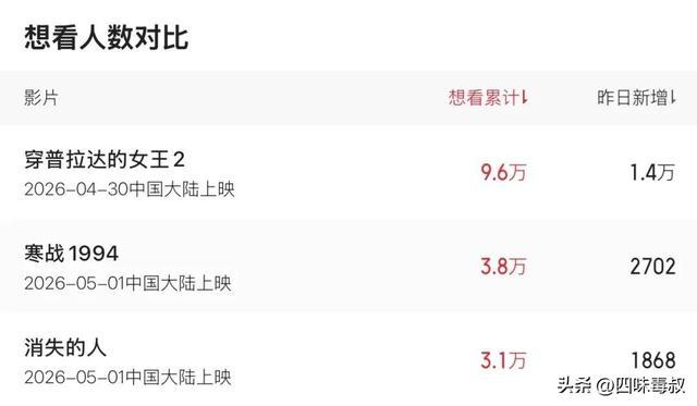 而目前热度最高的《穿普拉达的女王2》作为职场女性励志片,且由原班人马倾力打造,但具体口碑还需待影片上映后再观察。